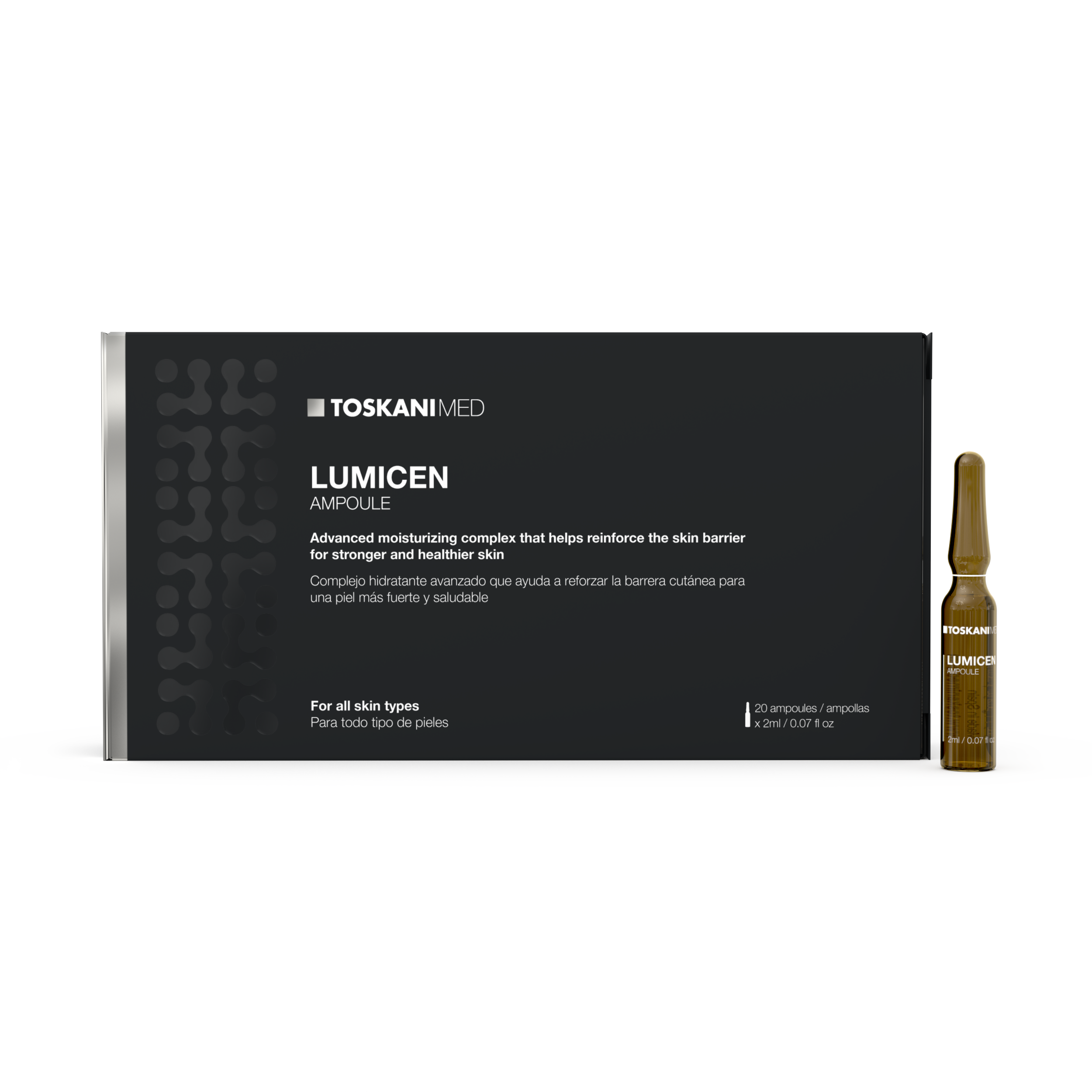TOSKANI Lumicen je otopina natrijeve DNA koja povećava sintezu endogene hijaluronske kiseline. DNA je polinukleotid, glavna komponenta kromosoma, s dvostrukom dekstrorotatornom strukturom spirale. Konkretno, natrijeva DNA je neiritirajuća tvar sa snažnim hidratantnim i površinskim antioksidativnim djelovanjem. Kada se nanese na kožu, DNA ima trofičko djelovanje na nju i uzrokuje promjene u stanicama bazalnog sloja epidermisa. Na taj način suzbija degradaciju kolagena uzrokovanu suncem, duhanom i oksidativnim stresom, čime se poboljšava struktura kože i potiče vidljivo pomlađivanje.