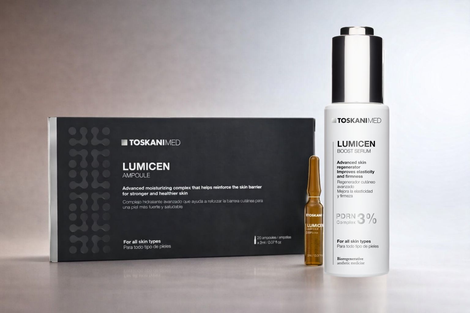 TOSKANI MED set Lumicen sadrži ampule 20x2ml za 20 tretmana microneedling-a i Lumicen Boost serum za kućnu njega sa 3% polinukleotida.